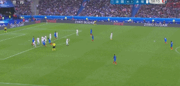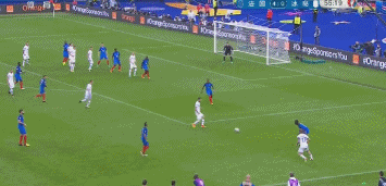 第12分钟,法国队进球了!马图伊迪中圈弧附近左侧给出一记长传球,禁区里左侧吉鲁得球直接张弓搭箭一脚怒射,皮球直奔球门右侧破网,法国队1-0领先冰岛队!
