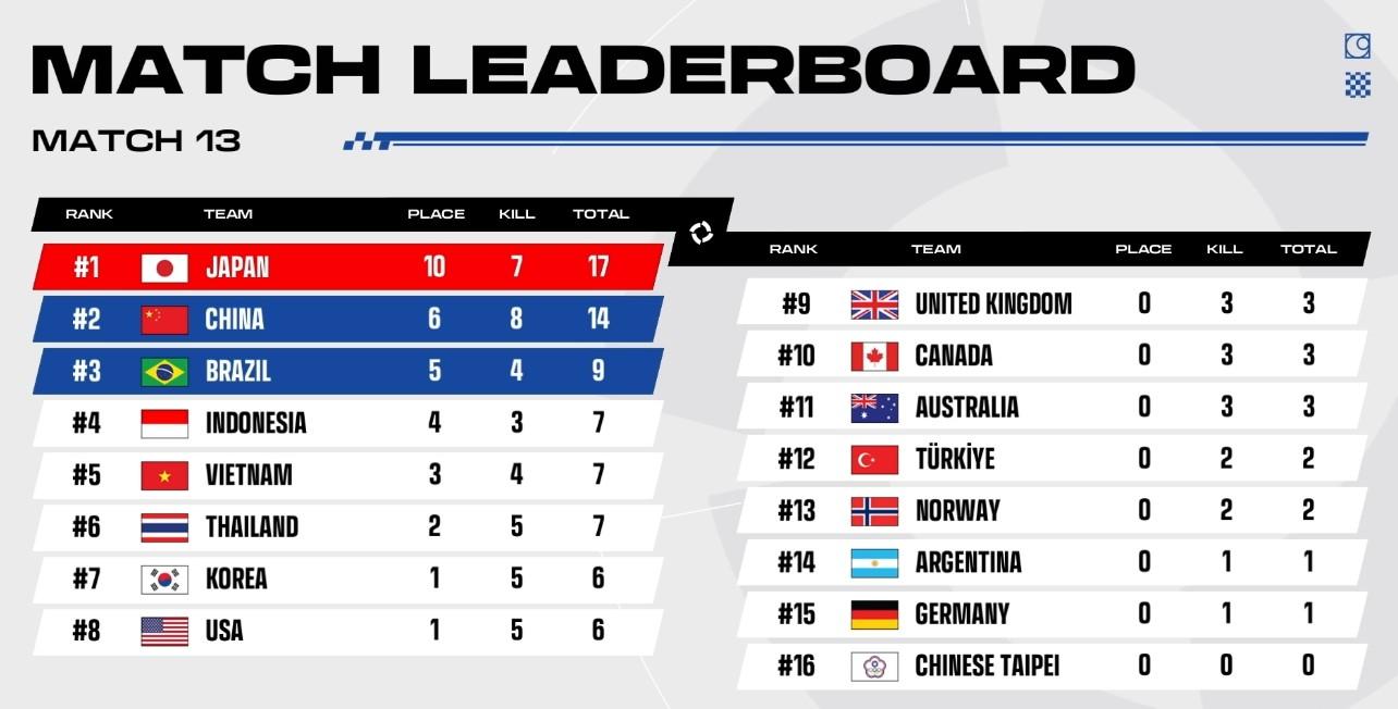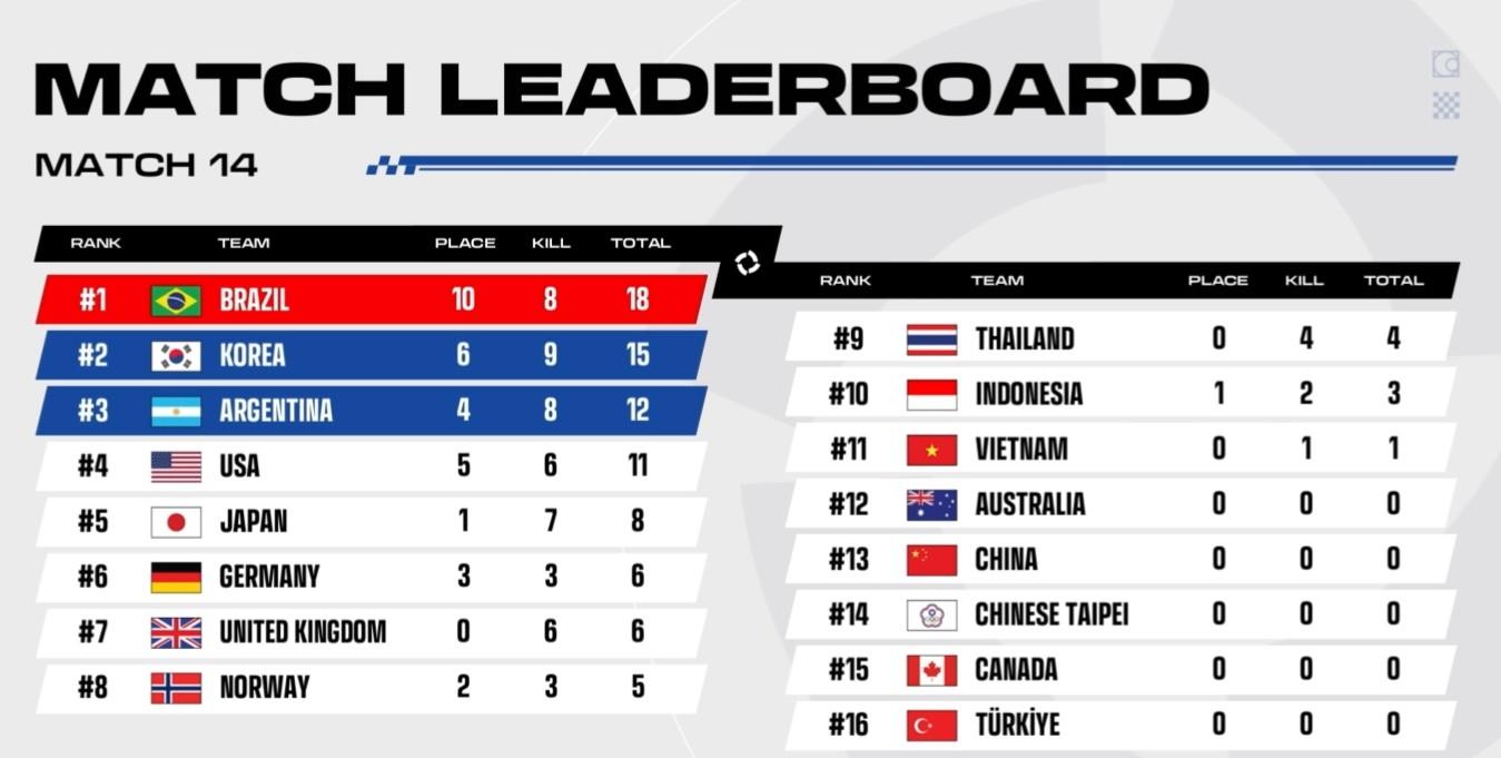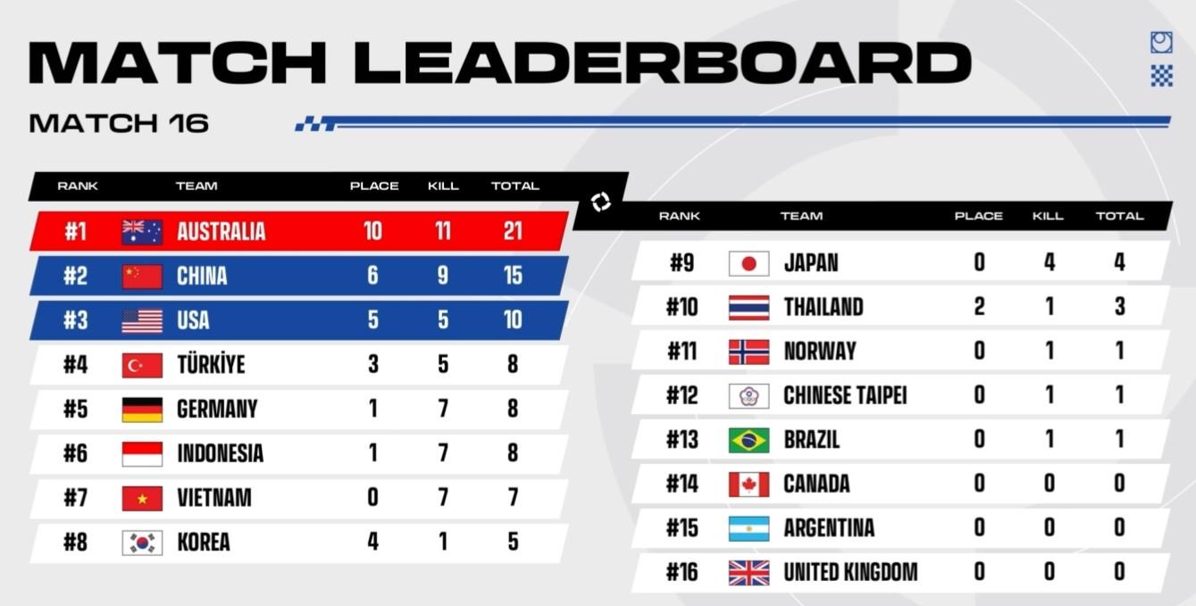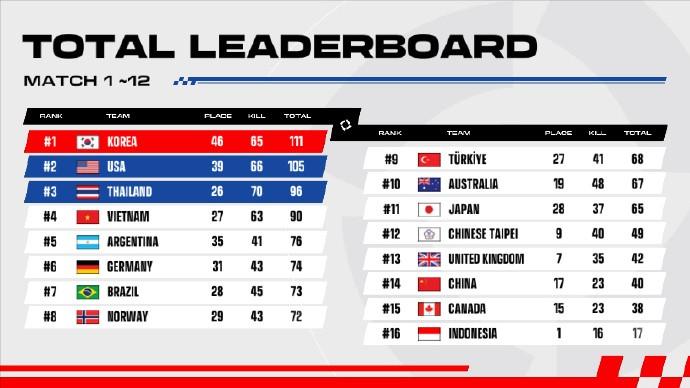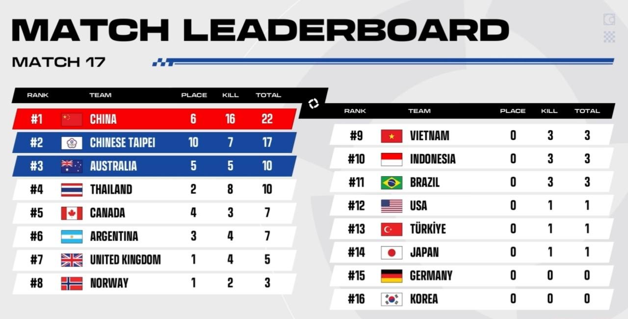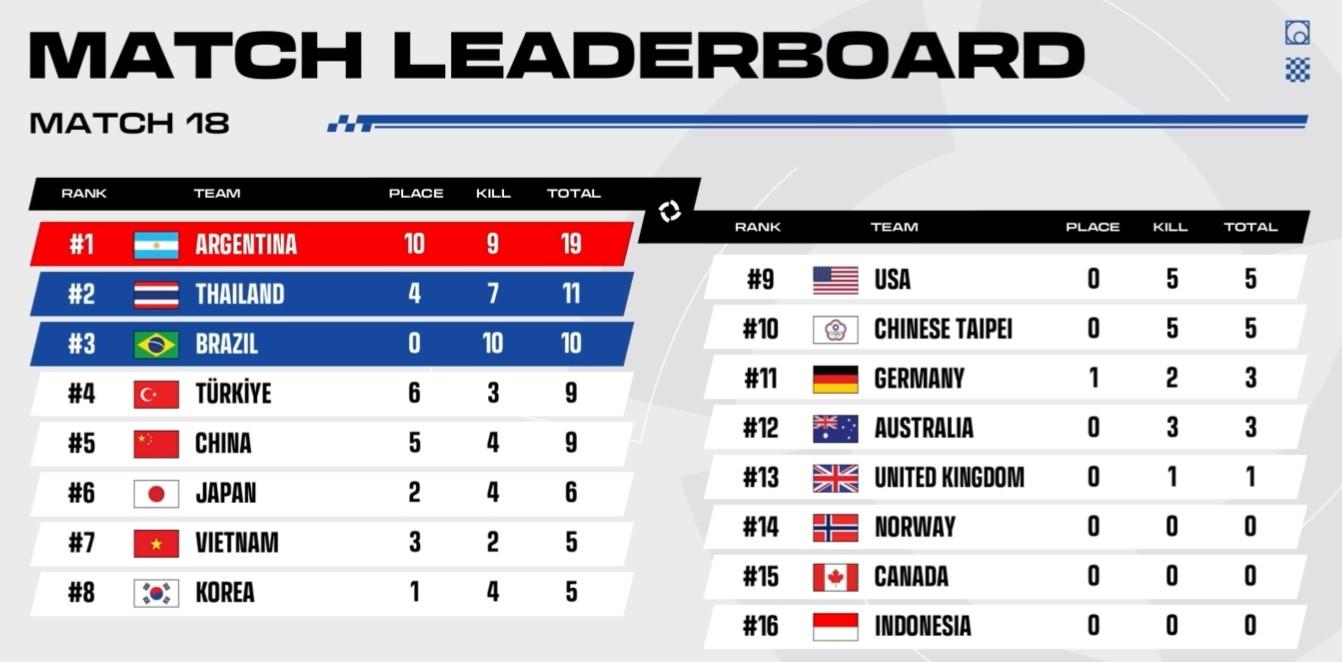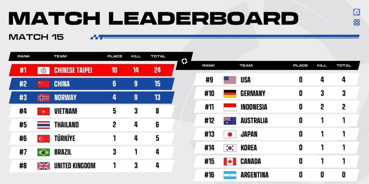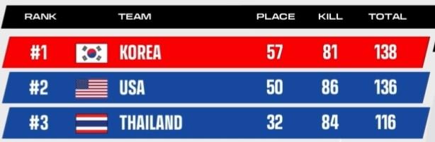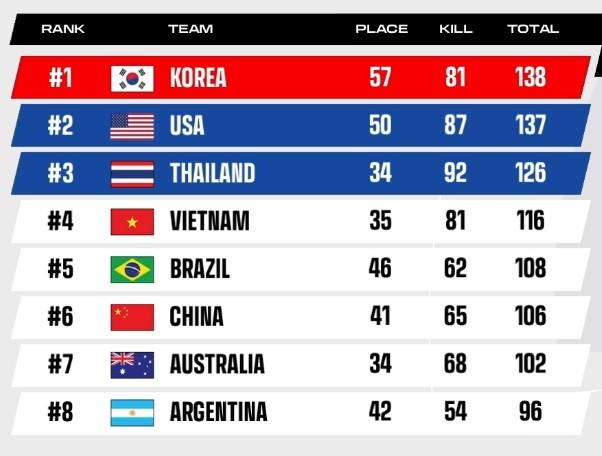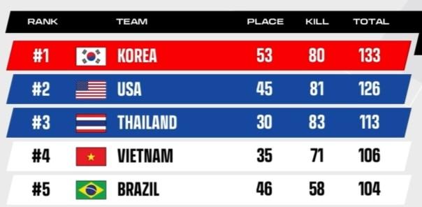 目前排名第一的韩国队后续被越南团灭,单局仅拿1分。排名第2的美国队很快也被中国台湾队淘汰,单局拿到4分。两支中国队伍成为搅局者。