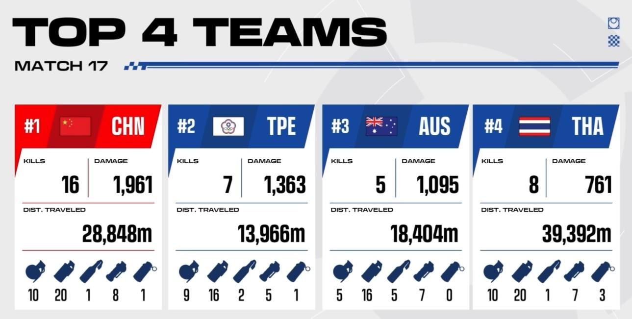 决赛圈混战,满编的中国台湾代表队成功吃鸡,单局14击杀拿到24分。PCL小队15分第2,挪威独狼intenZ帮助队伍拿到13分。