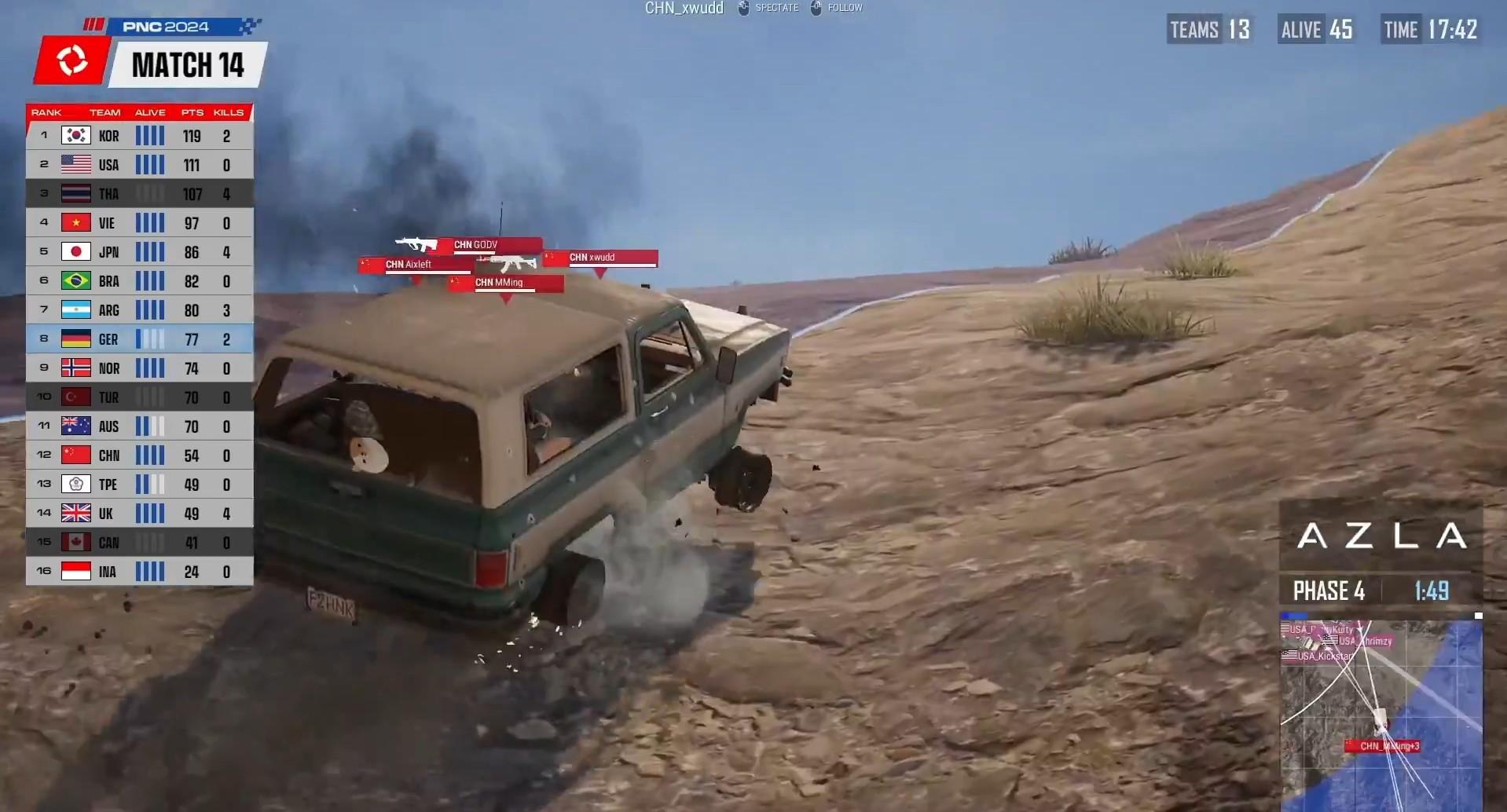 MATCH13,PCL小队成功跻身决赛圈,与巴西代表队爆发团战,Aixleft状态出色打出突破口。无奈日本代表队牢牢占据优势位置,一波轻松劝架淘汰了另外两队,吃到本届PNC第2鸡。PCL小队最终拿到本局第2,单局拿到8个击杀共14分。