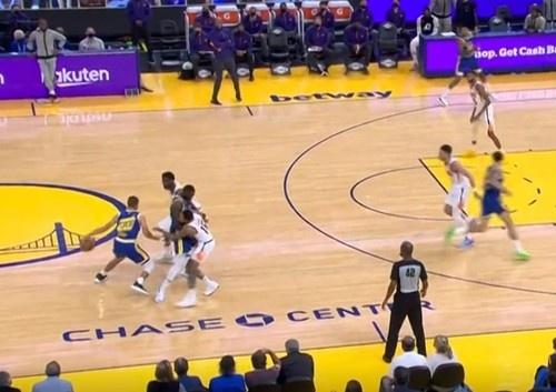 太阳此役防守端派布里奇斯主防库里,逢库里与艾顿对位的鲁尼/追梦打挡拆时,直接对库里进行双人夹击,艾顿扑到三分线外参与协防。太阳开场奠定基调,既限制库里直接借单挡掩护出手三分,又限制勇士以库里为持球箭头打出流畅的挡拆配合,蒙蒂-威廉姆斯力求通过双人逢挡拆夹击将库里的持球启动阻绝在三分线之外。