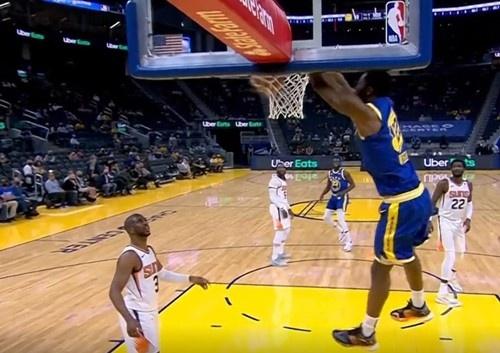 勇士开场在中线前进行了一次库里发起高位挡拆试探防守,利用夹击展开局部多打少,贝兹莫尔底角空位三分先声夺人,直接受益于库有引力;勇士明确太阳对库里的夹击策略后,阵地战以追梦为主持球点,库里打无球规避直接双人夹击,追梦为策应轴联动诸将空切袭筐,辅以维金斯利用单挡掩护找艾顿单挑——勇士首节的进攻归结为三条路:库里无球抓机会、库追挡拆后由追梦呼应空位终结点、山穷水尽交给维金斯。