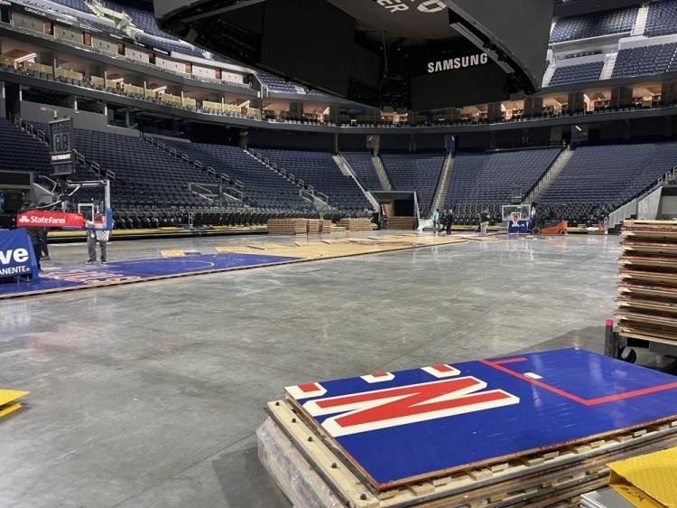在接到这个转播安排的变动之后,大通中心的工作人员也是紧急加班更换部分地板,据记者马库斯-汤普森透露,更换地板是因为全美直播的比赛的赞助商不一样,地板上的广告也就要跟着变。