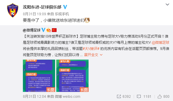 最近,沈阳东进官方平台又多了一项新功能,即参加各种抽奖活动,为球迷谋福利。比如,在一家平台搞的转发抽10件世界杯正版球衣的知名博主评选活动中,东进官方平台就参与了,并称中了奖就送给球迷们。