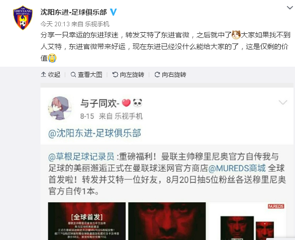 9月4日晚,沈阳东进官方平台更是发布了一条感人的消息。原来,有一位球迷在参加一个转发并@一位好友的活动中,获得了1本曼联主帅穆里尼奥的官方自传,而其@的好友,正是沈阳东进官方平台。对此,东进官方平台感慨地说:“大家如果找不到人艾特,东进官微带来好运,现在东进已经没什么能给大家的了,这是仅剩的价值。“