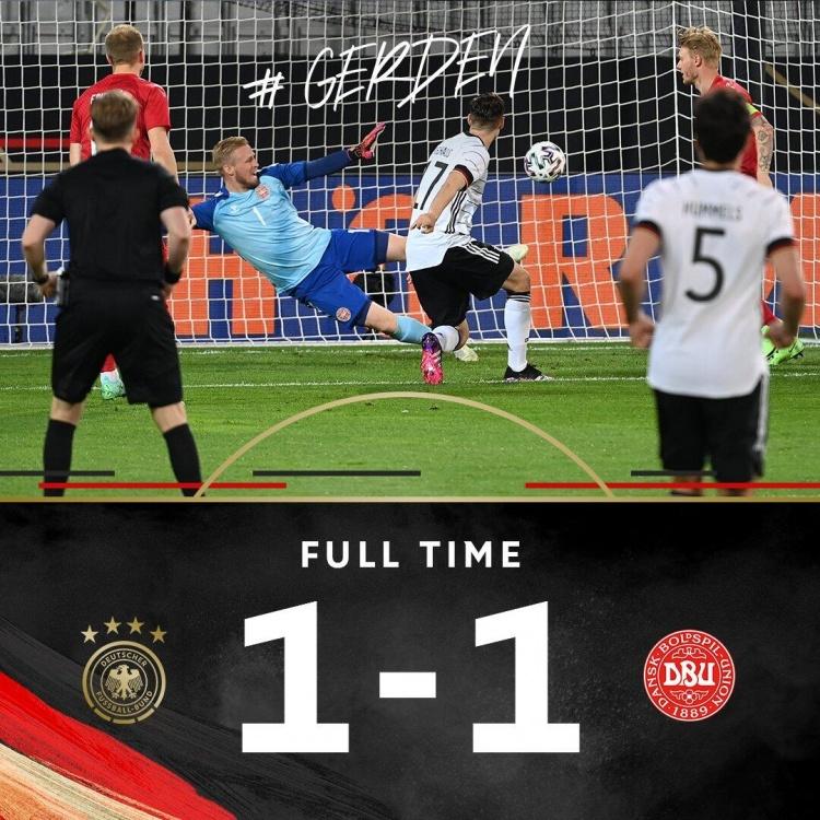 最终,全场比赛结束,德国在主场1-1与丹麦握手言和。
