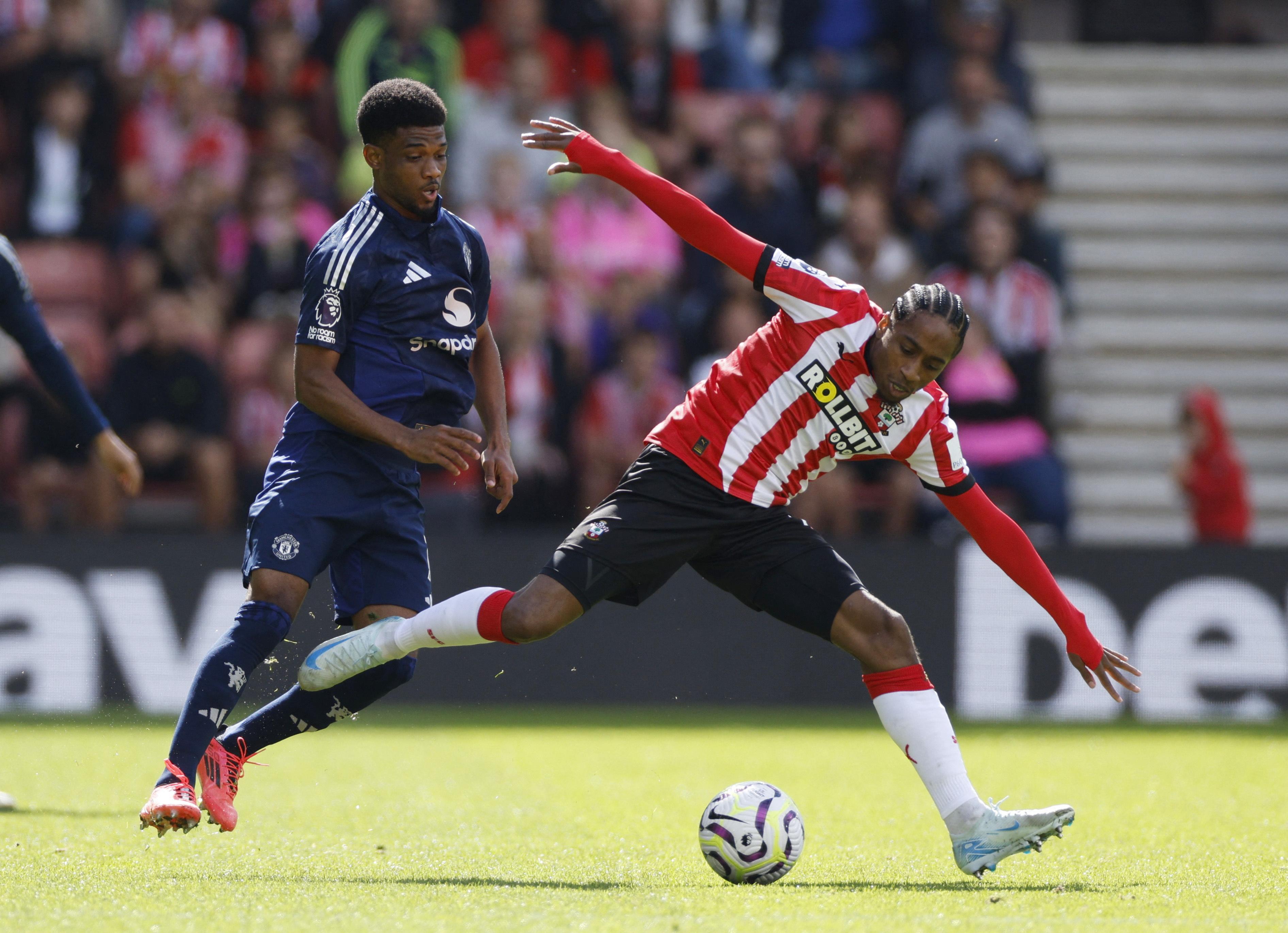 9月14日,曼联队球员迪亚洛(左)与南安普敦队球员沃克-彼得斯拼抢。 新华社/路透