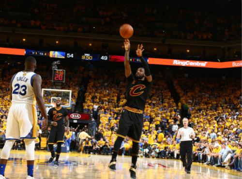 欧文持球,连续的体前变向,后撤步三分出手,欧文命中了一记决定比赛走势的三分球。