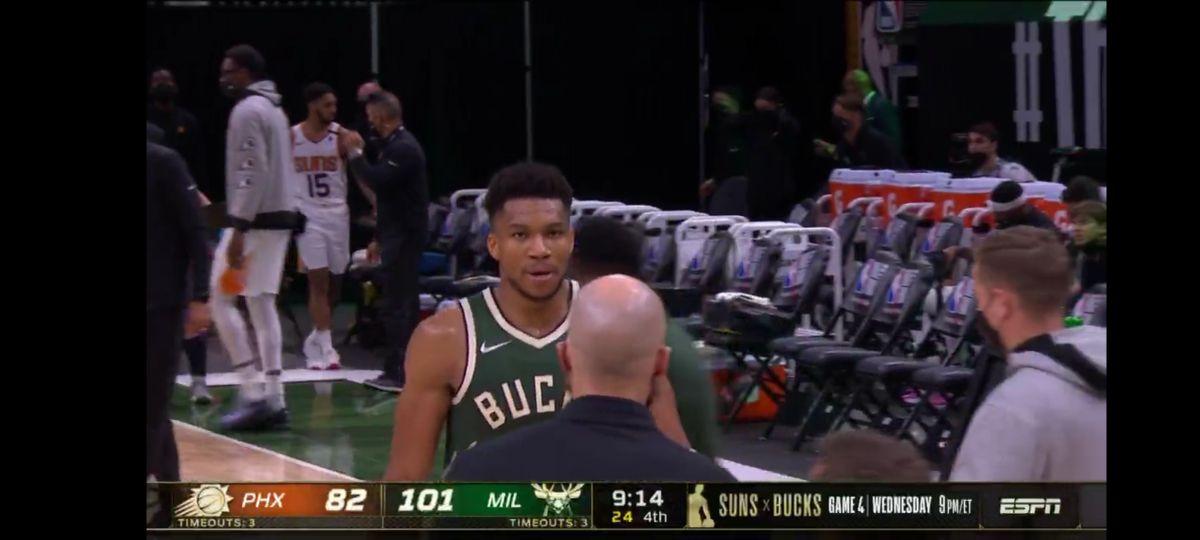 第四节雄鹿字母哥疯狂冲击篮下造犯规,不过字母哥今晚的罚球还算可以,把比分扩大到20分。