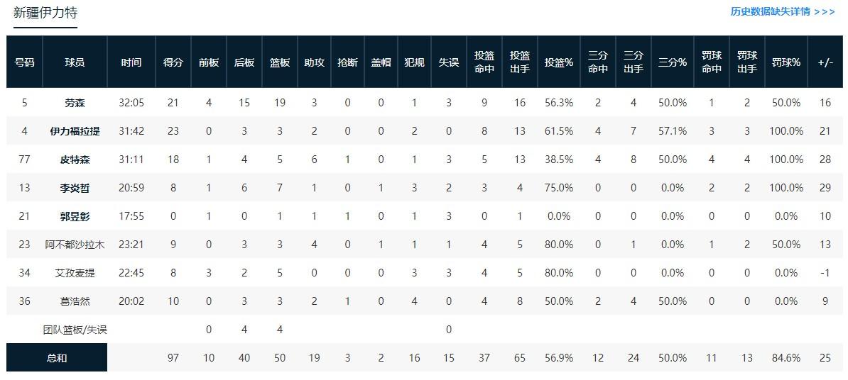 新疆:劳森24分16篮板、阿不都17分13篮板、皮特森19分、齐麟9分4篮板、李炎哲4分5篮板、西尔扎提8分5篮板、赵睿8分。