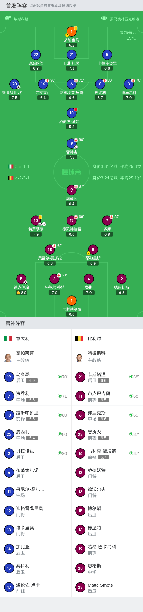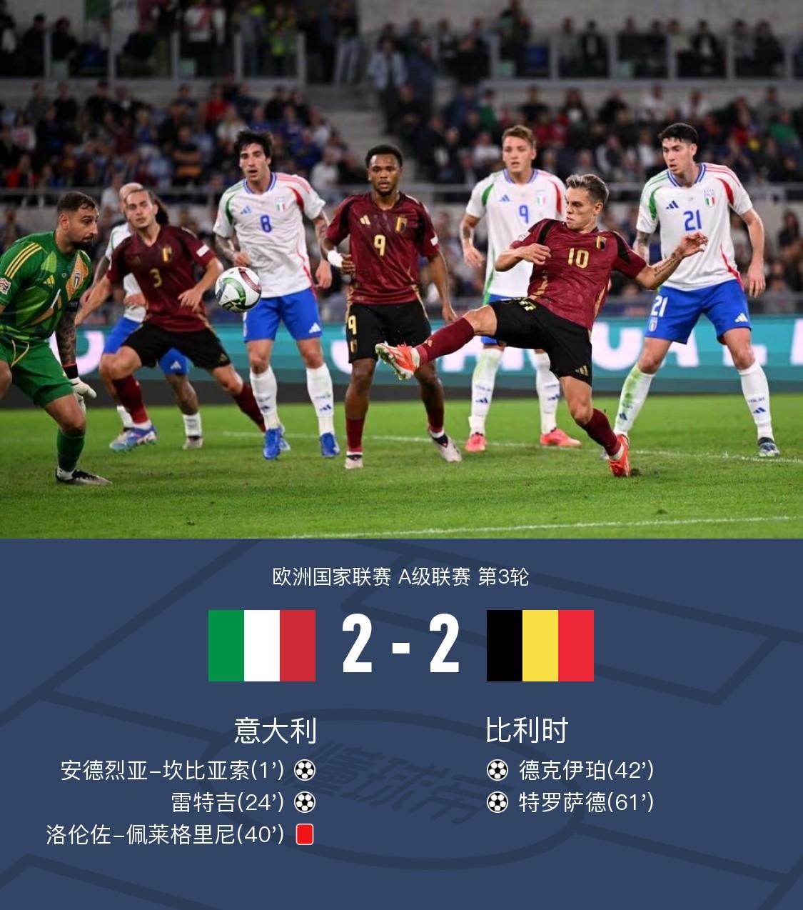 在欧洲国家联赛A级联赛的较量中,意大利与比利时展开了一场激烈的对决。开场仅仅1分钟,坎比亚索闪击破门。随后,坎比亚索低射被扑,雷特吉补射建功。上半场结束前,佩莱格里尼背后铲倒蒂特被主裁直红罚下。特罗萨德做球,德克伊珀劲射扳回一城。下半场,特罗萨德在角球进攻中垫射扳平比分。全场比赛结束,比利时连追两球2-2战平十人意大利。