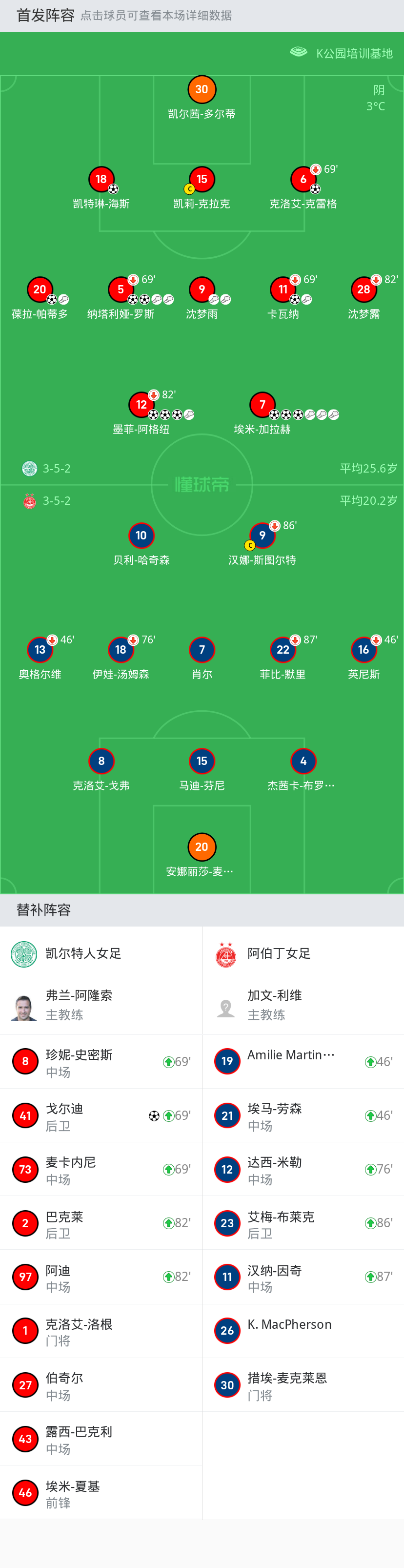 凯尔特人女足 首发:9-沈梦雨, 28-沈梦露, 30-凯尔茜-多尔蒂, 15-凯莉-克拉克, 6-克洛艾-克雷格, 18-凯特琳-海斯, 7-埃米-加拉赫, 11-卡瓦纳, 20-葆拉-帕蒂多, 5-纳塔利娅-罗斯, 12-墨菲-阿格纽