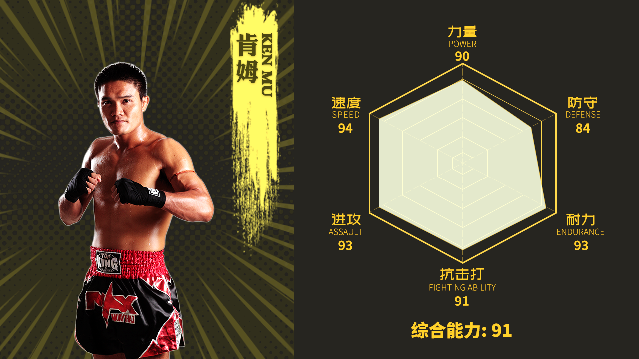 与邱建良相反,肯姆是一位重击型选手,他的组合远没有邱建良多,拳法也没有邱建良快,但在打击力量上却是67——70KG中最强的选手之一。他在《勇士的荣耀》与铁英华和吉祥的比赛中,让人们知道了在绝对身体素质与力量优势面前,技巧便不是决定胜负的最重要因素。