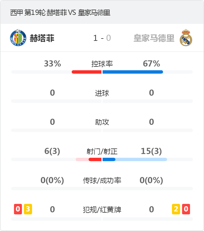 北京时间1月2日21:00,21/22赛季西甲联赛第19轮先赛一场,赫塔菲迎战皇家马德里。上半场于纳尔为赫塔菲首开纪录,下半场两队均无建树,最终赫塔菲主场1-0击败皇马,皇马遭遇新年首败,各项赛事15场不败终结。
