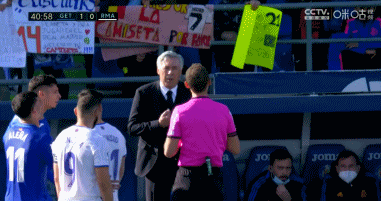第42分钟,安切洛蒂在场外略显焦急,意大利人因为与裁判喋喋不休被出示黄牌警告。