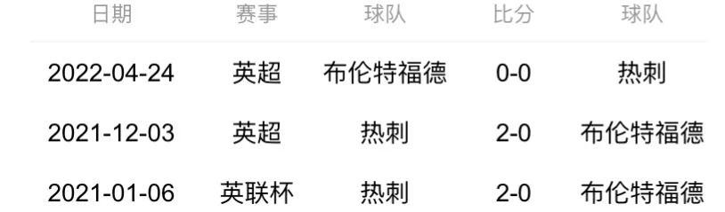 交战历史:双方近3次交战,布伦特福德0胜1平2负,进0球,失4球,布伦特福德和托特纳姆热刺在历史交锋中处于下风。