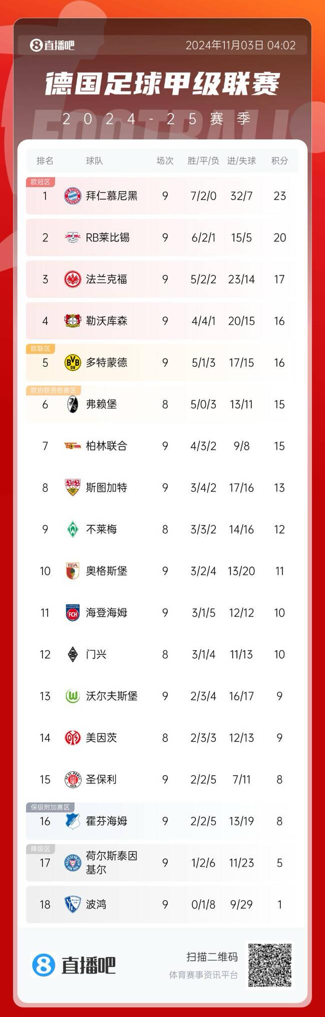 直播吧11月3日讯 拜仁在本轮德甲3-0完胜柏林联,继续领跑德甲积分榜。