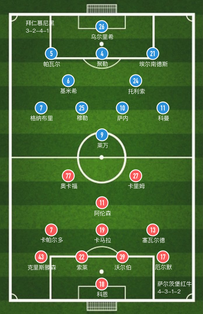 拜仁慕尼黑(3-2-4-1): 26-乌尔里希,5-帕瓦尔,4-聚勒,21-埃尔南德斯,6-基米希,24-托利索(80' 18-萨比策),7-格纳布里(78' 13-楚波莫廷),25-穆勒,10-萨内,11-科曼,9-莱万