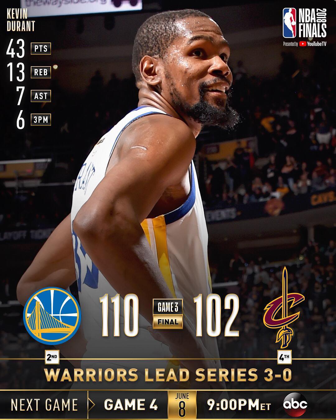 虎扑6月7日讯 今日勇士客场110-102战胜骑士,总决赛大比分3-0领先。NBA官方赛后在Instagram更新了勇士取胜的战报图。