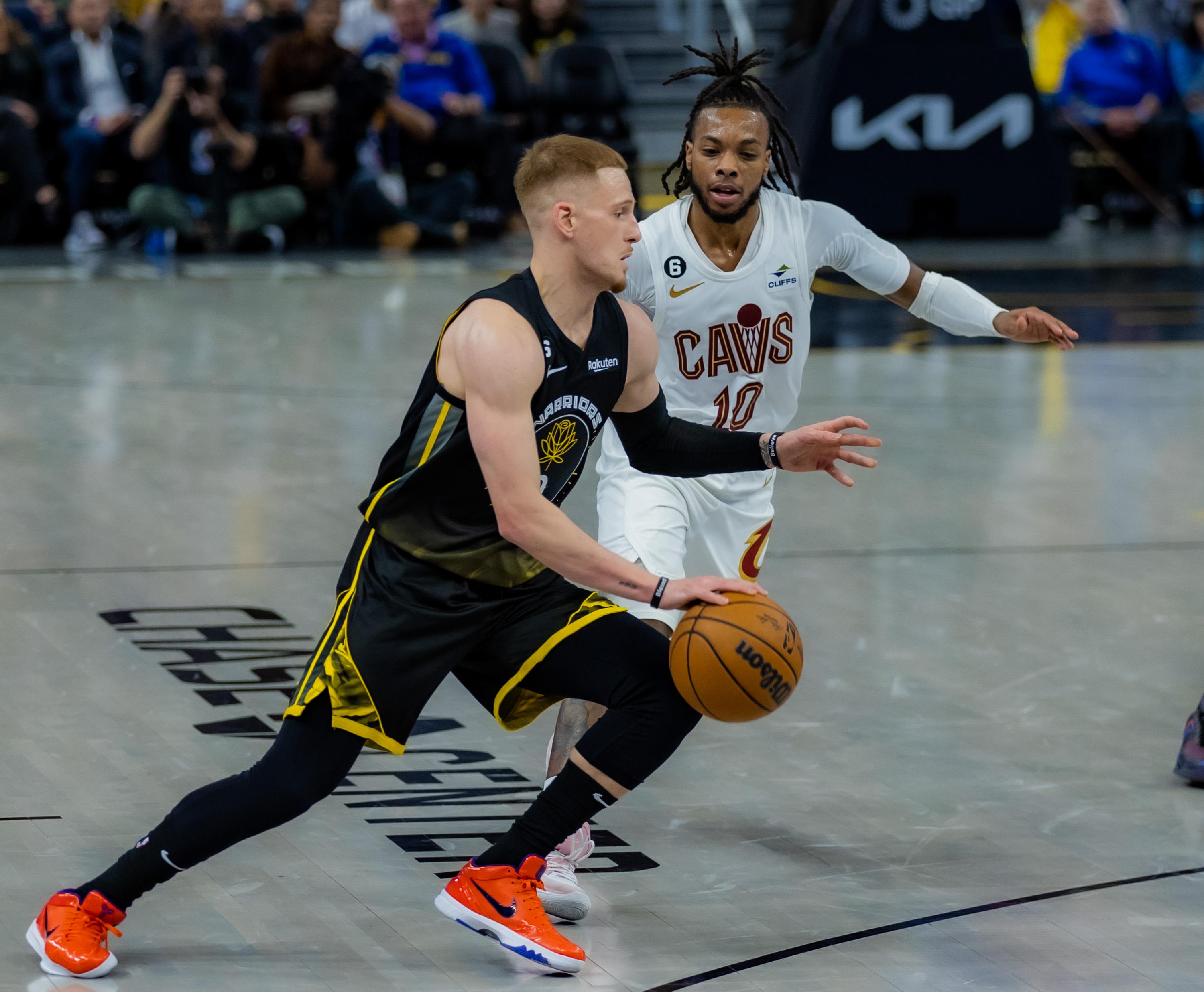 11月11日,骑士队球员多诺万·米切尔(右)在比赛中突破勇士队球员维金斯的防守。 新华社发(董旭东摄)