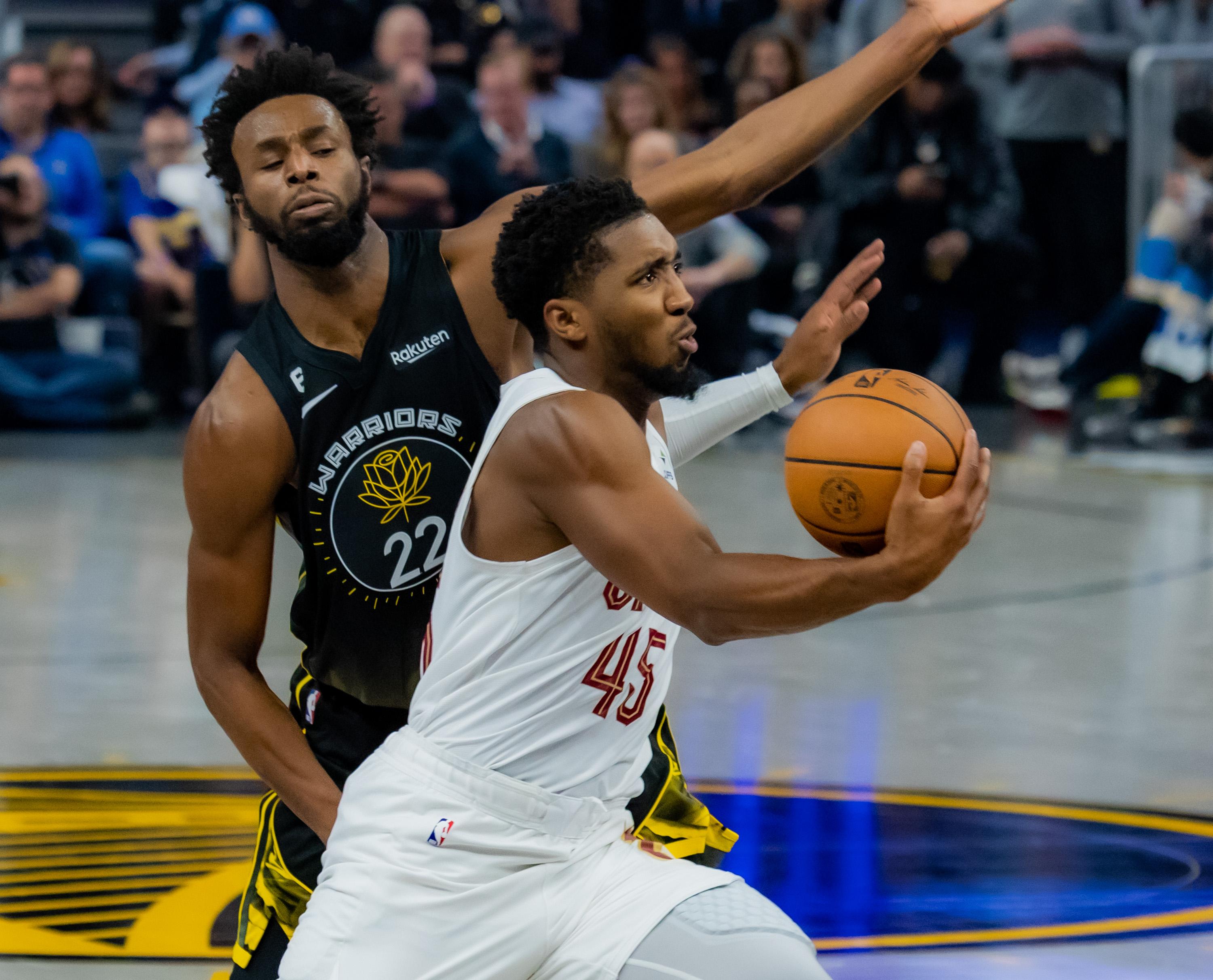 11月11日,骑士队球员多诺万·米切尔(左)在勇士队球员威金斯的防守下进攻。 新华社发(董旭东摄)