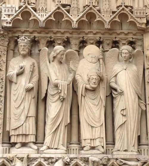 在这种背景下,公元272年,圣丹尼被异教斩首殉教。传说圣丹尼被斩首后还能手持自己的首级,从巴黎市中心走到郊区才死去,有兴趣的人,可以看看巴黎圣母院门口的雕像,其中一个手里拿着自己首级的,就是圣丹尼 咯。