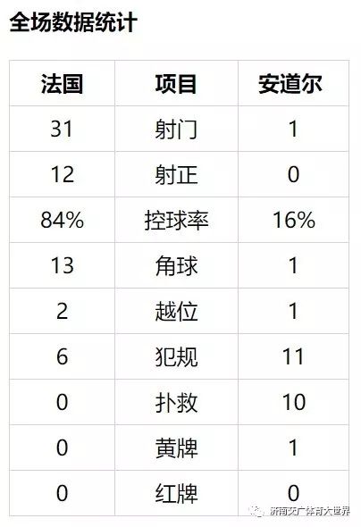 上半时安道尔没有1次射门。下半时开始7分钟,法国扩大比分!格列兹曼左侧任意球斜传,朗格莱小禁区边缘甩头顶进左下角,2比0。