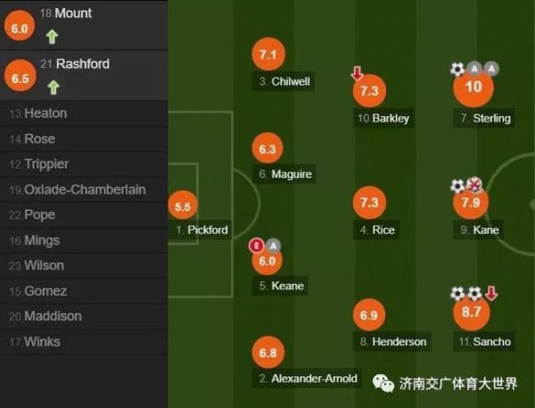 英格兰(4-3-3):1-皮克福德;2-阿诺德,5-基恩,6-马圭尔,3-奇尔维尔;8-亨德森,4-莱斯,10-巴克利(83',18-芒特);11-桑乔(85',21-拉什福德),9-凯恩,7-斯特林