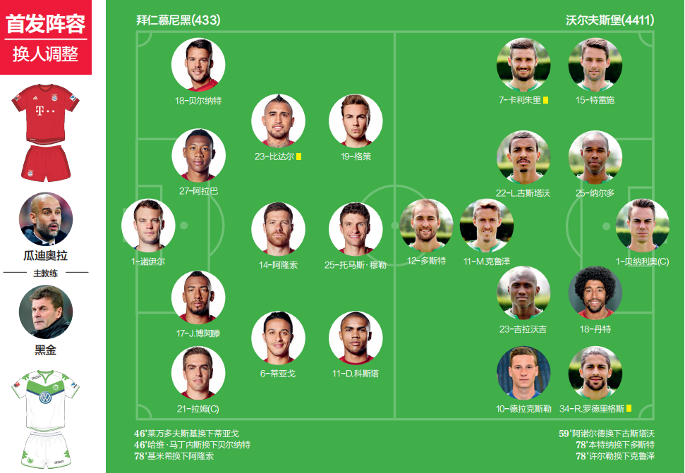 第4分钟,兹沃纳雷克禁区右侧抽射击中立柱内侧弹入球门,拜仁慕尼黑1-0沃尔夫斯堡。↓