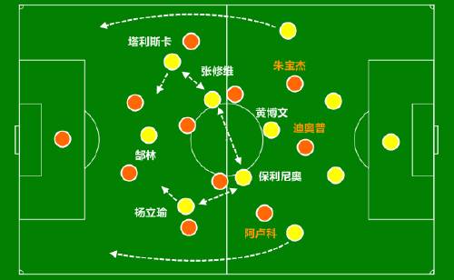 从模拟战术板上可以看到,广州恒大的4141阵型下,两翼的边前卫塔利斯卡和杨立瑜可以随时内收攻击,成为冲击禁区和核心区域的攻击点。另外一方面,在边前卫内收之后,边后卫套上利用两翼空间,形成更好的空间利用。