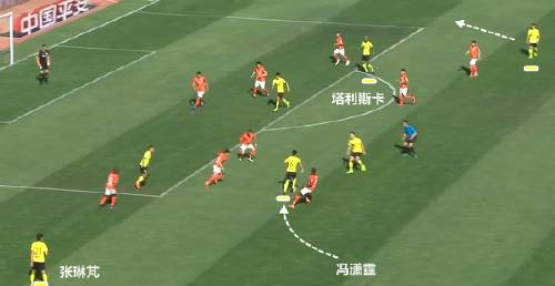 可以看到,这一次恒大中卫冯潇霆,甚至都带球前压到北京人和禁区正面。侧翼的位置张琳芃套上接应,塔利斯卡和杨立瑜也是禁区内的攻击点,将北京人和的队形完全压制住。