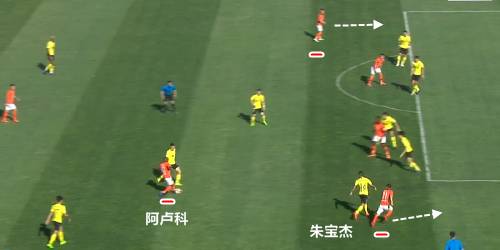 在另外一次进攻中,右路的位置,北京人和送出一脚漂亮地转移球。左路位置饶伟辉拿球之后内切,对着肋部空虚的位置送出一记直塞。前插的朱宝杰获得很好的机会,可惜没能把握住。