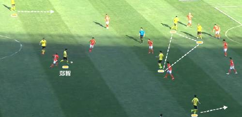 下半场比赛中,广州恒大将郑智安排出场,进一步加强进攻。他们尽管只有10人作战,但是在进攻端的人员投入很大。禁区正面3人接应,两翼同样有攻击球员套上,拉开进攻宽度。