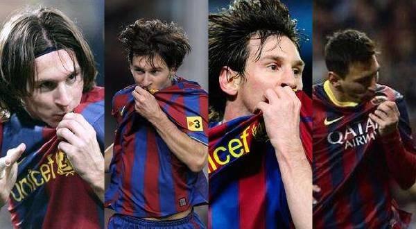 梅西在伯纳乌“晒衣服”之前,他在国家德比进球后最喜欢的动作是亲吻球衣。不同时代的梅西,完成不同方式的亲吻,都牢牢印刻在球迷的脑海中。