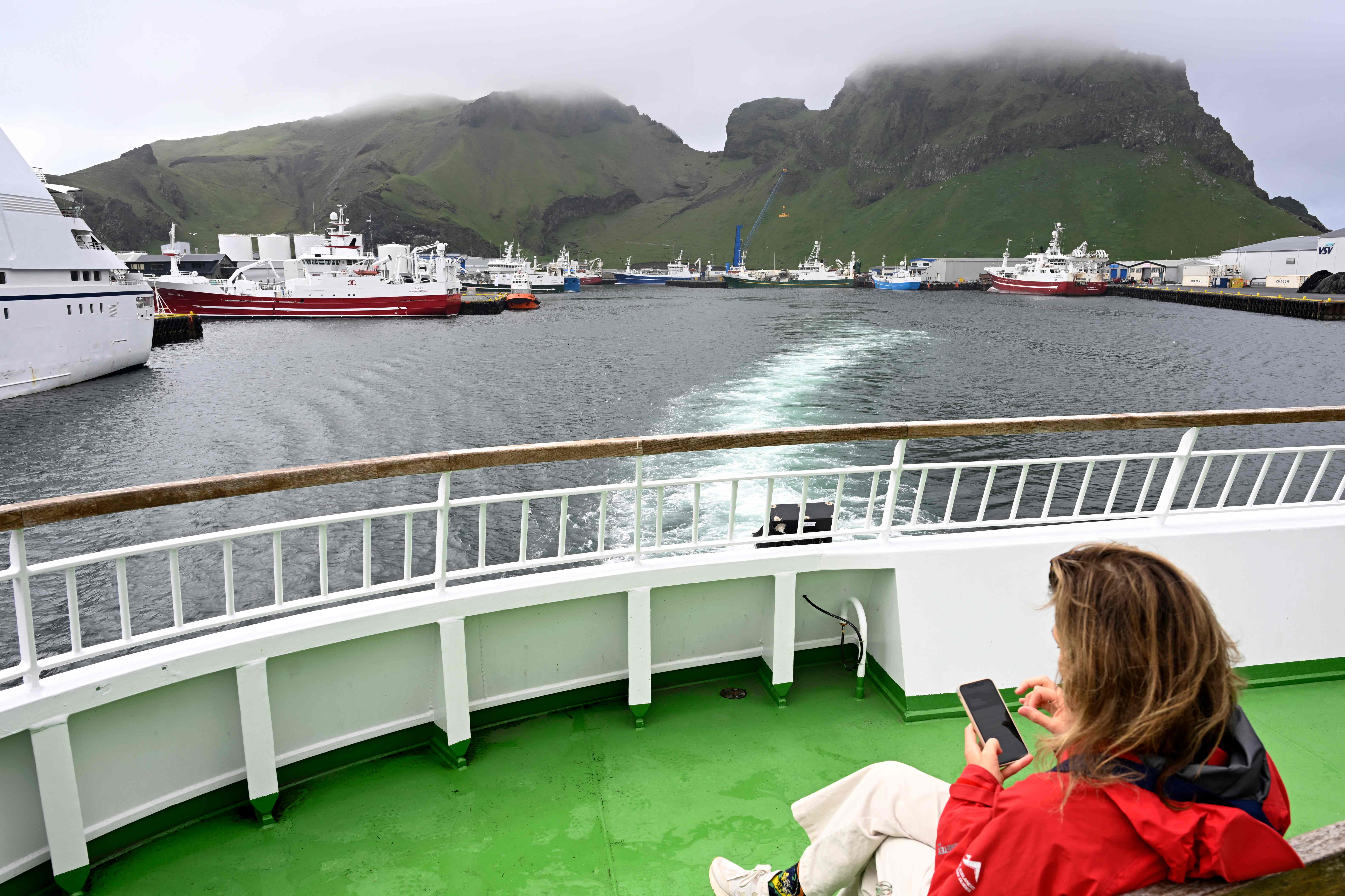 6月26日,一名游客乘船离开冰岛韦斯特曼纳群岛。 新华社/法新