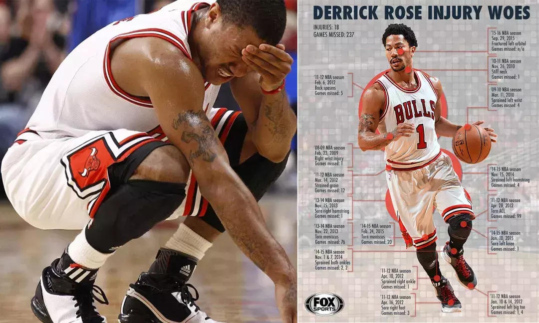 就在罗斯和公牛前途一片光明时,伤病粉碎了芝加哥人的美梦。2012年到2014年间,罗斯先后遭遇左膝交叉韧带撕裂和右膝半月板撕裂两大毁灭性伤病,3个赛季只出战了49场,一代巨星迅速陨落。