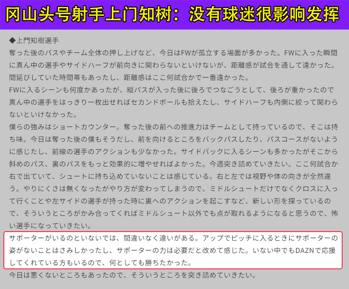 而冈山绿雉呢?他们的球员们认为,主场打得不好,是因为没有球迷。