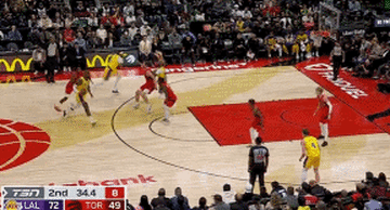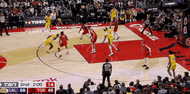 第二节,前半节双方持续冲框篮筐得手,展开拉锯维持20分上下领先,后半节上来双方继续对攻,节末湖人加强防守连续反击扩大领先,半场战罢,湖人76-51猛龙。