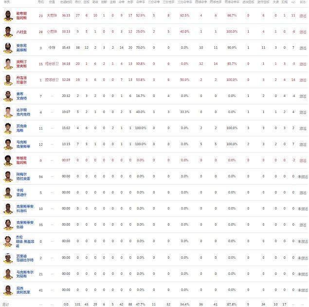 戴维斯20投14中,11罚10中得到38分12个篮板3次抢断2次封盖,詹姆斯27分10次助攻6个篮板0次失误,八村塁12中3得到9分5篮板,里夫斯14罚12中得到20分6次助攻2次抢断,拉塞尔19分6次助攻。