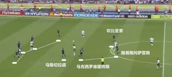 可以看到的是,阿根廷的4231阵型下,右路的攻击手马克西罗德里格斯是一个关键的平衡点。他在防守的时候,将会回撤到后腰一线。这样一来,双后腰之一的马斯切拉诺将会最大程度地横移补防左路索林的身后。考虑到当时马斯切拉诺的覆盖和防守处于巅峰期,这样的一个做法也是较为合理的。