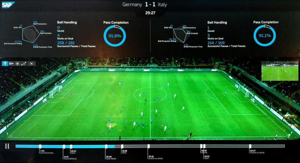 资料显示据SAP介绍,在短短10分钟内,10名球员用3个球进行训练,可产生超过700万个可供分析的数据点,而SAP数据分析平台可对这些数据进行实时处理。