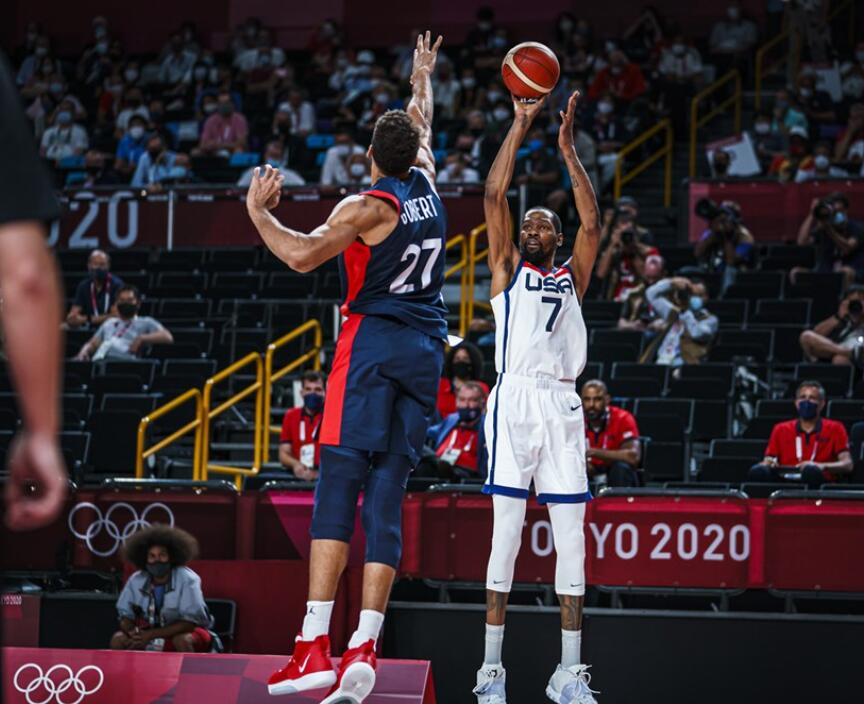 东京奥运会上,美国和法国两度对决,战绩1胜1负。在小组赛的对阵中,美国男篮上半场结束带着9分的优势,在下半场遭到法国男篮强势反扑,富尼耶个人表现尤为出色,最终法国男篮以83-76战胜美国男篮;在决赛中,美国凭借杜兰特和塔图姆的发挥,以87-82击败法国队夺冠,此战,杜兰特斩获29分6篮板3助攻,塔图姆得到19分7篮板。