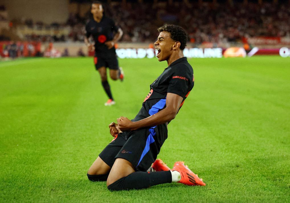 9月19日,巴塞罗那队球员亚马尔(前)在比赛中进球后庆祝。新华社/路透