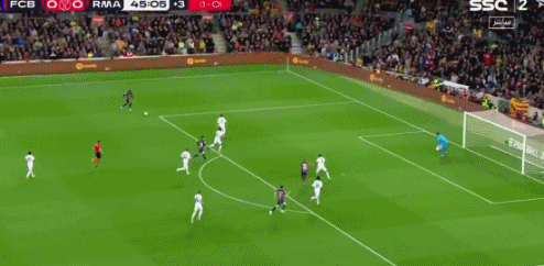 第45+1分钟,凯西前场左侧传中,莱万的射门被库尔图瓦扑出,加维拿球再传被解围,皇马利用对手大举压上的机会打反击,维尼修斯带球狂奔,来到禁区前将球分向右侧,本泽马再把球磕回,维尼修斯的射门被孔德挡了一下,本泽马在皮球已经过线的情况下再补一脚,这个进球算在维尼修斯帐下,皇马1-0领先巴萨,上半场随即结束。