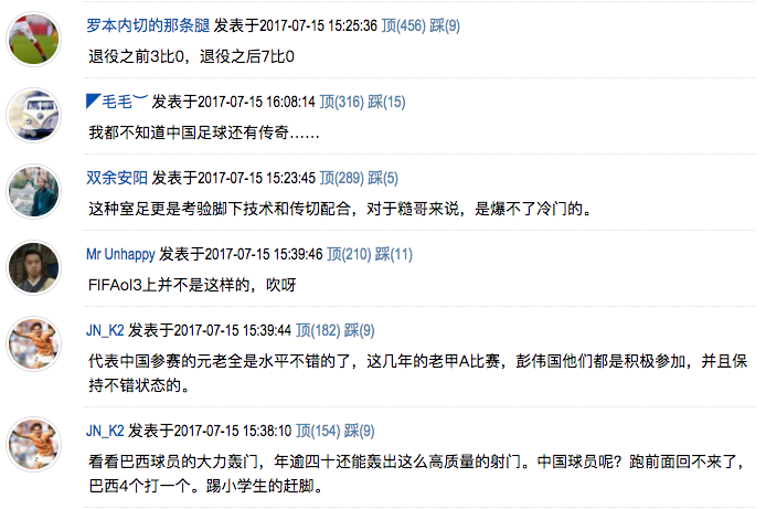 而中国的球迷们再看过比赛的视频后,纷纷吐槽说:“国足输球很正常都多少年了,我还是感谢国足又为全国人民来了一场盛宴,以后继续发扬,泡妞一流,工资一流,输球一流,感谢国足,啊门!”“坐观巴西队,十一个队员,用了九十分钟,踢进去七个球,这能算世界强队吗?这能算赢吗?这样的胜利叫耻辱!国足,没毛病!专业输球三十年,一直被模仿,从未被超越!”“巴西面对这样一个世界最差队,只进了七个球,我看受羞辱的是巴西队。”“看看巴西球员的大力轰门,年逾四十还能轰出这么高质量的射门。中国球员呢?跑前面回不来了,巴西4个打一个。踢小学生的赶脚。”“这种室足更是考验脚下技术和传切配合,对于糙哥来说,是爆不了冷门的。”“从u16输到了u46。”“退役之前3比0,退役之后7比0。”“我都不知道中国足球还有传奇……”