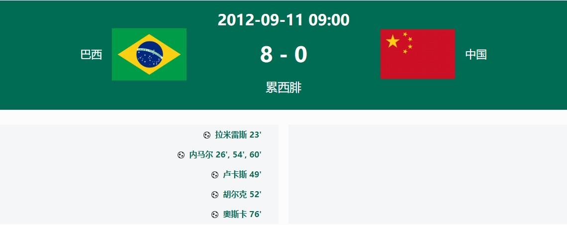 国足0-7不敌日本创造了多项输球记录。而国足历史上的最大比分输球来自12年前的0-8负于巴西。那场比赛年仅20岁的内马尔上演帽子戏法,奥斯卡、胡尔克均破门。当时的国足控球率有27%,6脚打门1脚射正。
