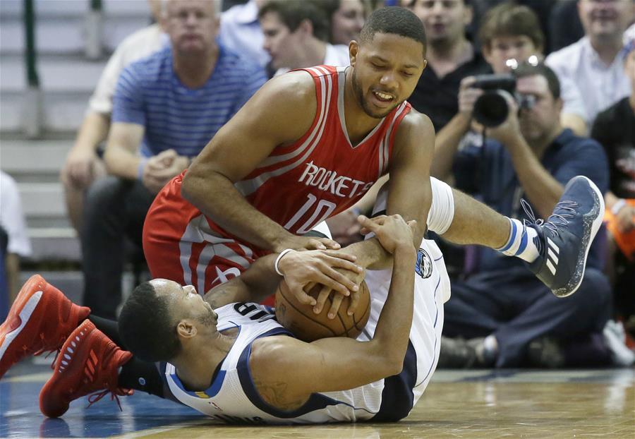 10月19日,火箭队球员戈登(上)与小牛队球员哈里斯在比赛中拼抢。当日,在2016-2017赛季NBA季前赛中,休斯敦火箭队客场以106比91战胜达拉斯小牛队。 新华社/美联