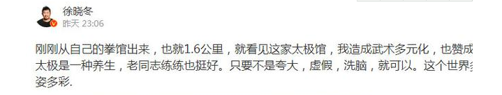 公众号上,自称“武林打假人”的综合格斗狂人徐某冬,他在1月25日写道:“刚刚从自己的拳馆出来,也就1.6公里,就看见这家太极馆,我赞成武术多元化,也赞成太极是一种养生,老同志练练也挺好。只要不是夸大、虚假、洗脑,就可以。这个世界多姿多彩。”