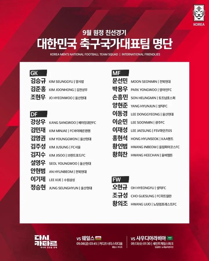 直播吧8月28日讯 今天,韩国足协公布了参加9月份国际友谊赛的国家队25人名单,孙兴慜、金玟哉、金英权、李在城等主力均入选名单。最近伤愈复出的李刚仁、金珍洙、宋范根等人并未进入名单。效力国安的姜祥佑,时隔1年零8个月重返国家队。9月份,韩国队将前往欧洲,分别在9月8日和13日交手威尔士、沙特。