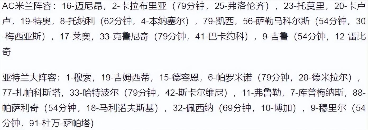 亚特兰大首发:1穆索;15德容恩,19吉姆西蒂,6帕洛米诺;33哈特鲍尔,7库普梅纳尔斯,11弗鲁埃勒,77扎帕科斯塔;32佩西纳(70' 10博加)、88帕萨利奇(55' 18马利诺夫斯基);9穆里尔(55' 91杜万-萨帕塔)